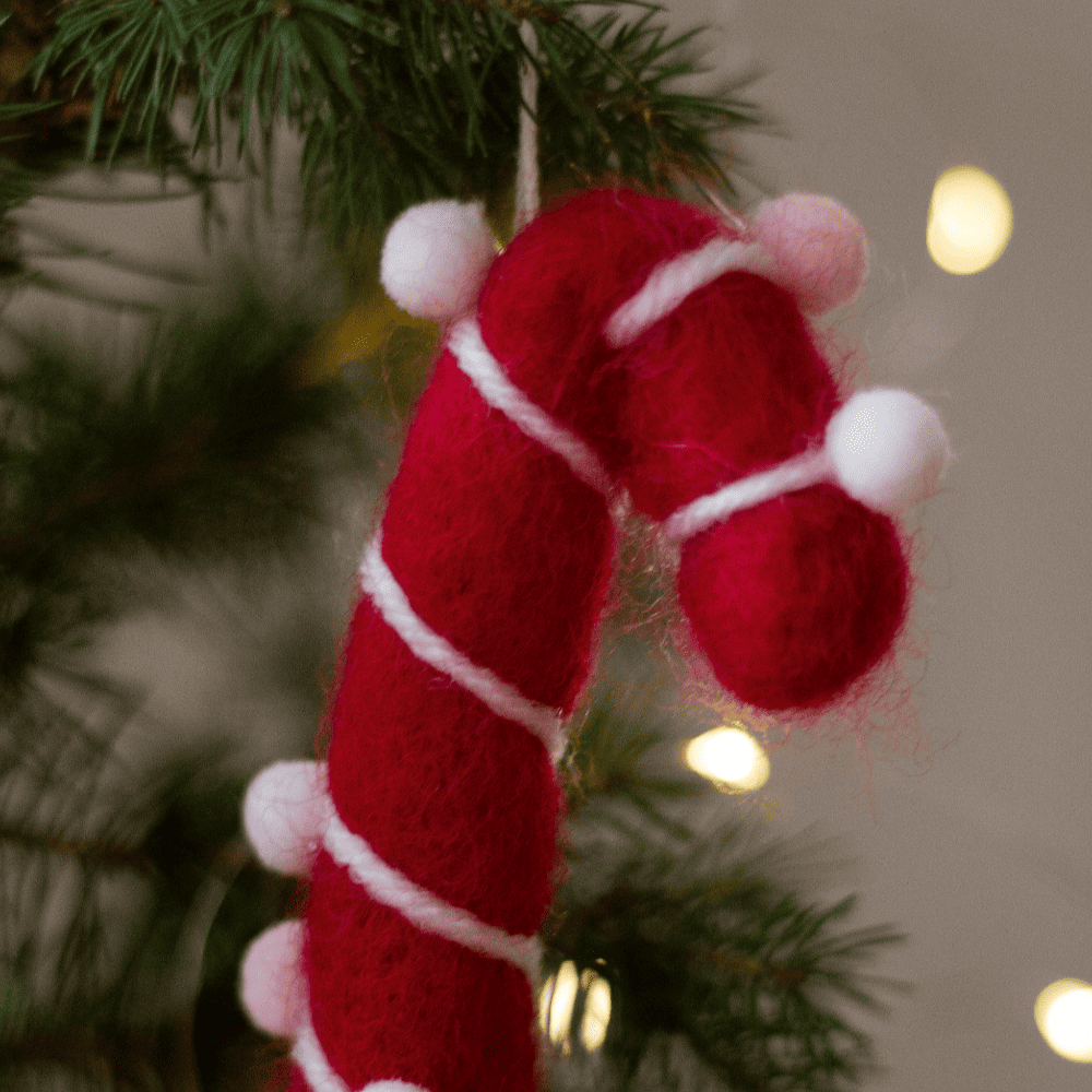 Bastón de caramelo, adorno para colgar, hecho de fieltro. Decorado con borlas.
