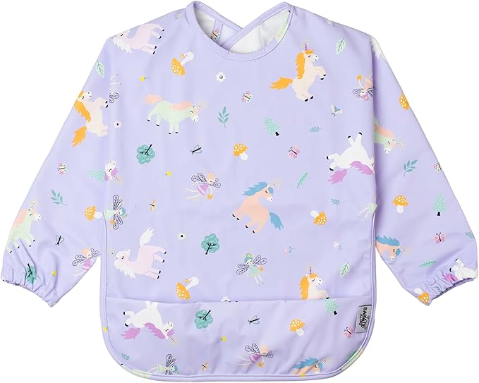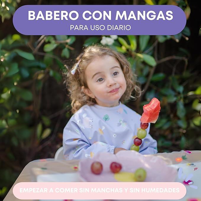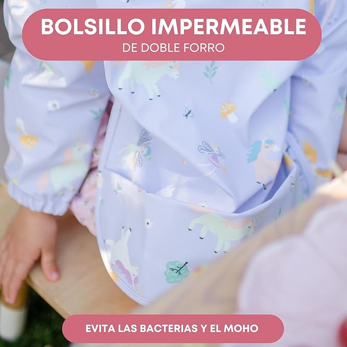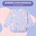 Babero con mangas con diseño ergonómico y cierre con velcro especial sin arañazos, pensado para durar hasta los 2 años y medio o 3.