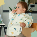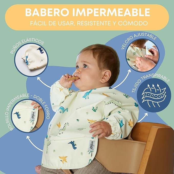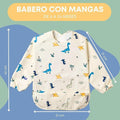 Babero con mangas con diseño ergonómico y cierre con velcro especial sin arañazos, pensado para durar hasta los 2 años y medio o 3.