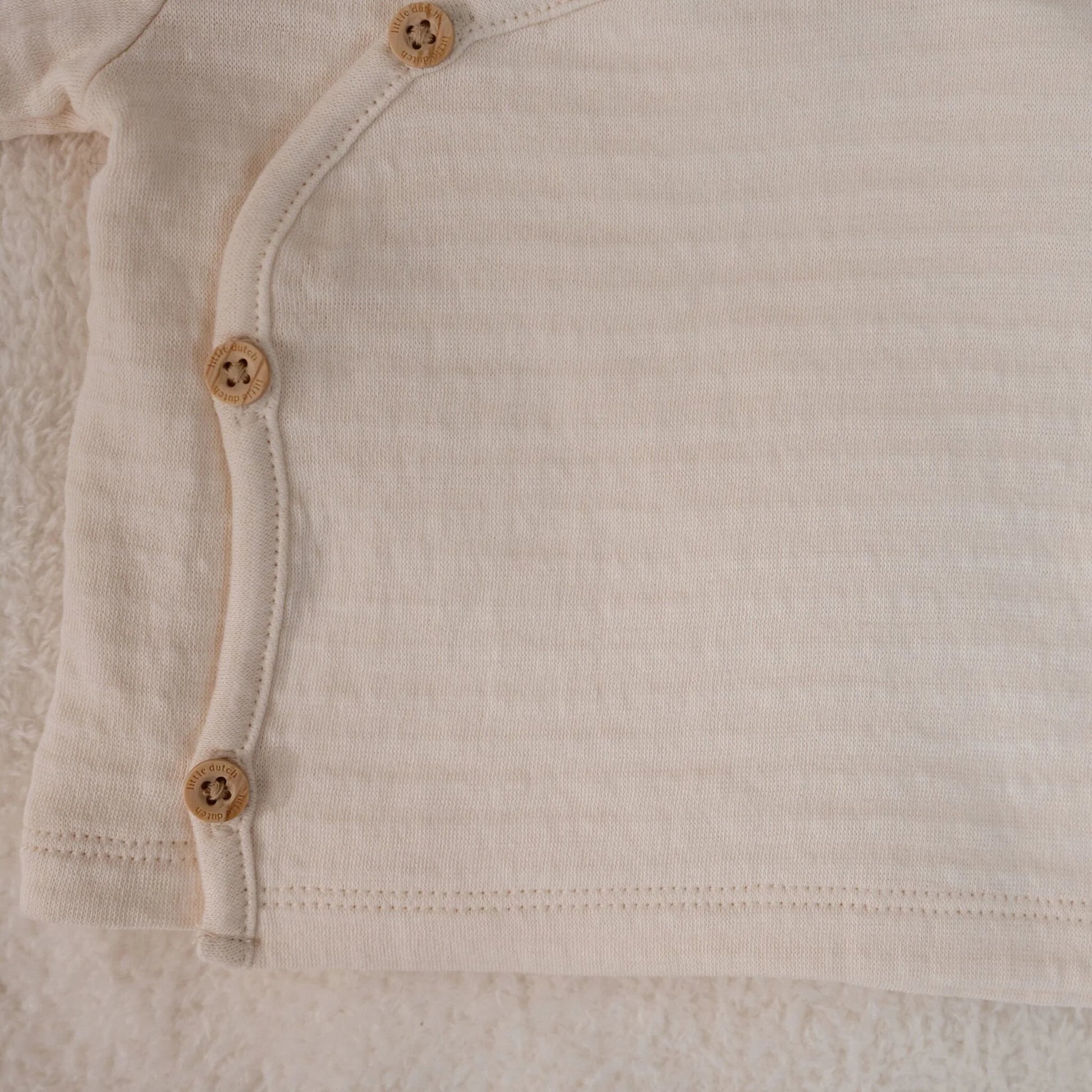 ¡Comodidad y estilo van de la mano! Esta camiseta cruzada color crema de manga larga está confeccionada con dos finas capas de tejido suave, que no solo proporciona una maravillosa sensación de calidez, sino que también tiene un efecto sutil y elegante. Los botones con efecto madera le dan un toque de encanto, mientras que el diseño superpuesto facilita su colocación y desvestimiento. Hecha de algodón orgánico y con certificación Oekotex, es suave y agradable para la piel de tu bebé.