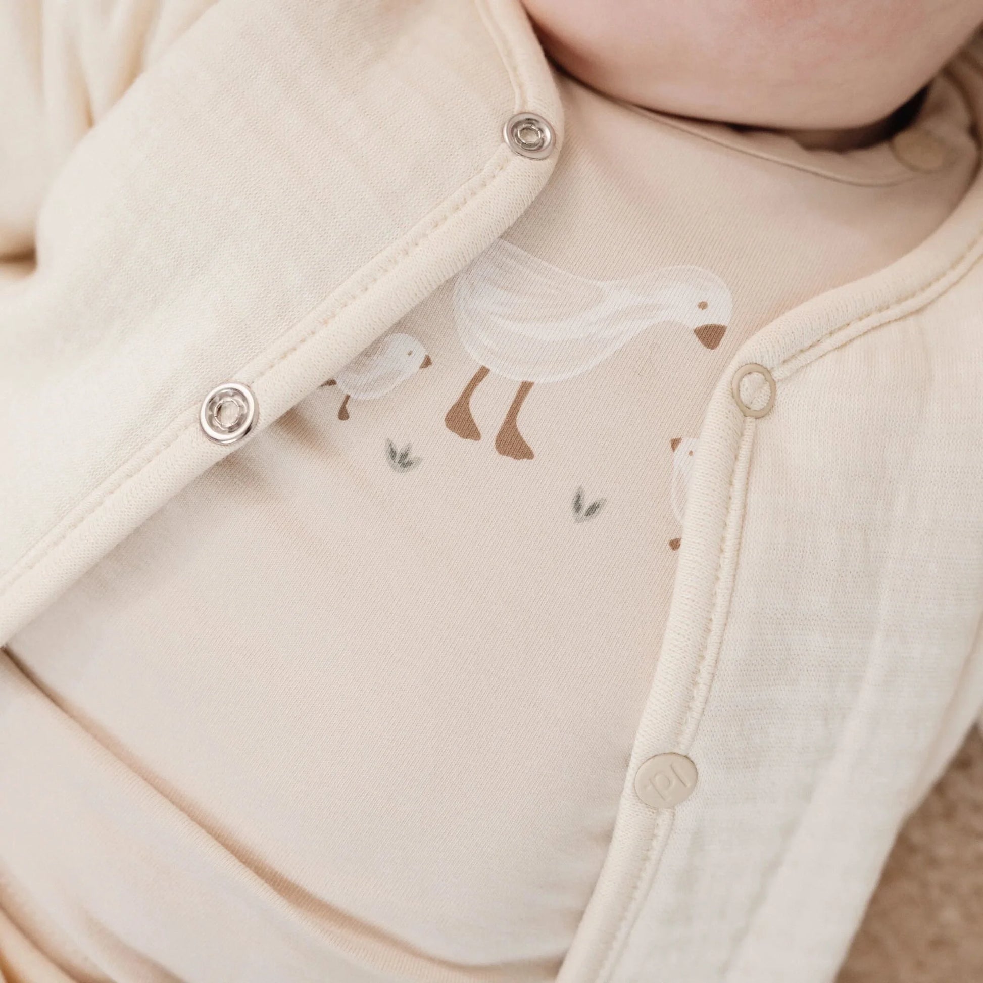 Esta camiseta de manga larga con un adorable estampado de ganso en el pecho es una opción cómoda y elegante para tu pequeño. Los dos prácticos botones del cuello facilitan mucho vestirlo y desvestirlo. Ideal para un cambio de ropa rápido. Hecha de suave algodón orgánico, respetuoso con la piel y el planeta. ¡Así, tu pequeño podrá explorar el mundo con estilo!