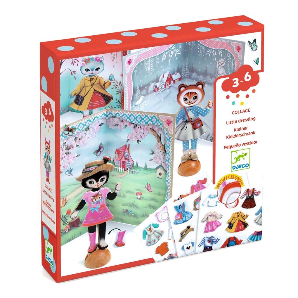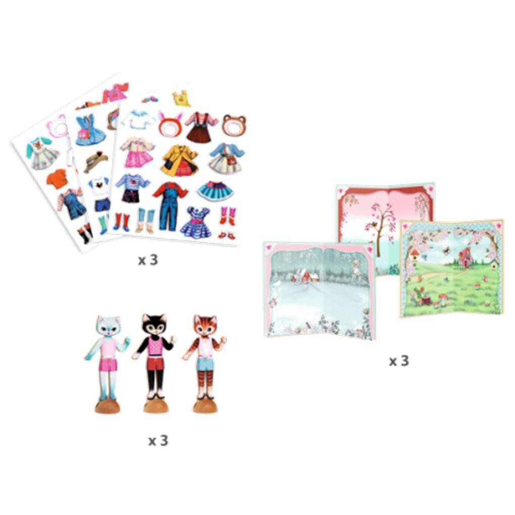 Contenido: 3 gatos de madera con soporte, + 45 prendas reposicionables y muy gruesas (3 láminas), 3 decorados de cartón y 1 cuadernillo de explicaciones paso a paso.