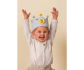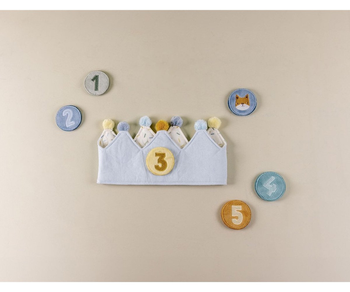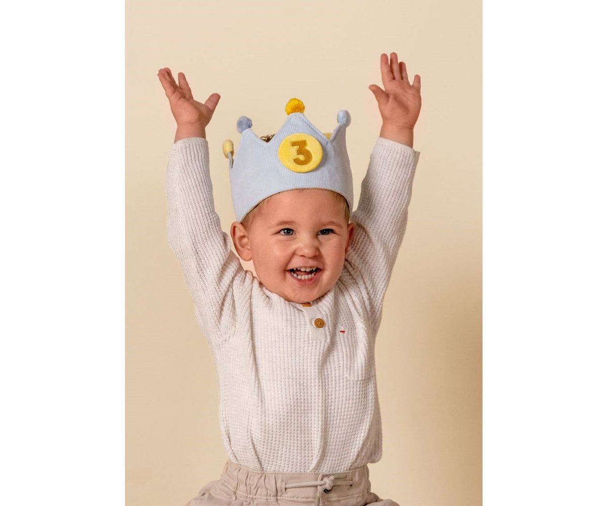 Esta preciosa corona con cierre de velcro será el complemento ideal para las celebraciones de cumpleaños de los peques. Confeccionada en tejido suave acolchado y acanalado de color azul con pompones en sus puntas, cuenta con números intercambiables del 1 al 5, lo que la hace ideal para acompañar a tu peque durante su crecimiento.