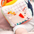 Este cubo de actividades se sujeta fácilmente con la cinta y es perfecto para bebés a partir de 9 meses. Se puede lavar a máquina después de quitar la caja de música.