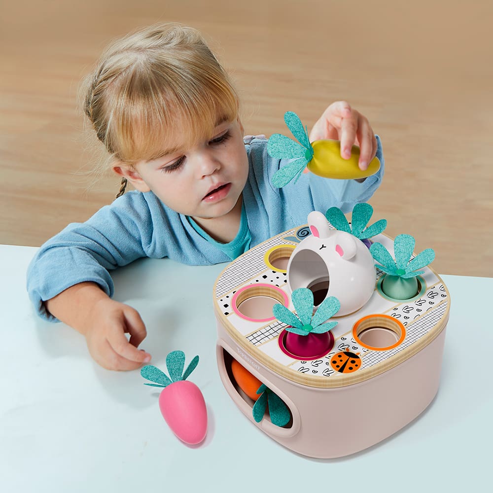 El juego Zanahorias para Clasificar y Emparejar es perfecto para niños que quieren descubrir los colores y las diferencias de tamaño. Incluye diez zanahorias de madera de diferentes tamaños y colores, además de una cesta de madera. Los niños pueden clasificar las zanahorias por tamaño o color y colocarlas en el agujero correspondiente de la cesta. Es un juego divertido que estimula la motricidad fina y la coordinación óculo-manual, a la vez que fomenta su imaginación.