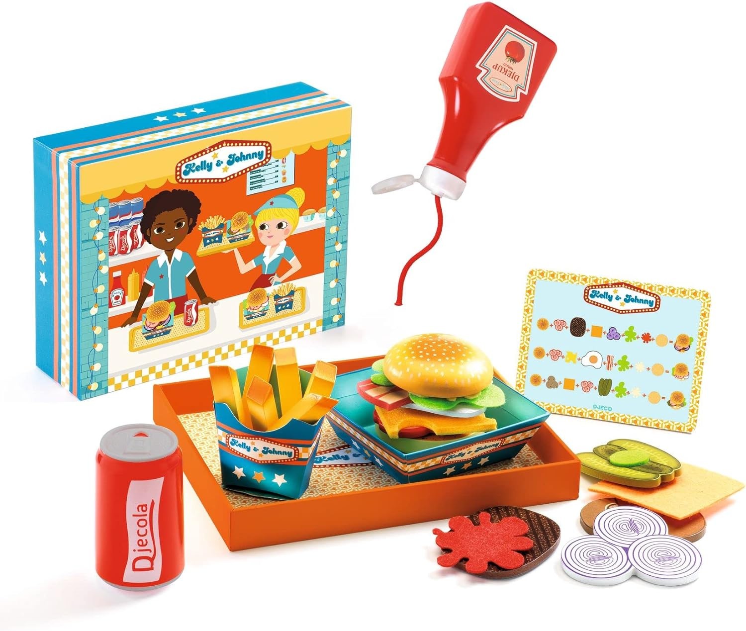 Contenido: 1 lata, 1 bote de ketchup, 8 ingredientes, 1 caja de hamburguesa, 6 patatas fritas de madera con 1 cono de cartón, 1 tarjeta menú, 1 caja de madera.