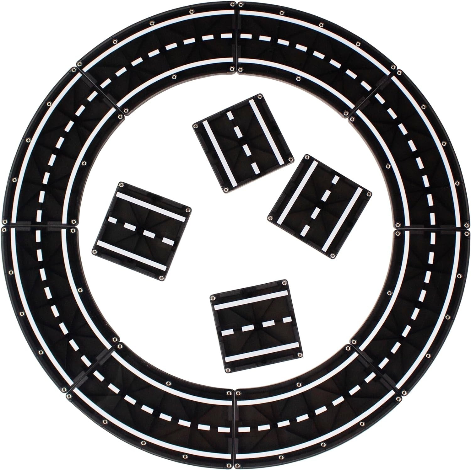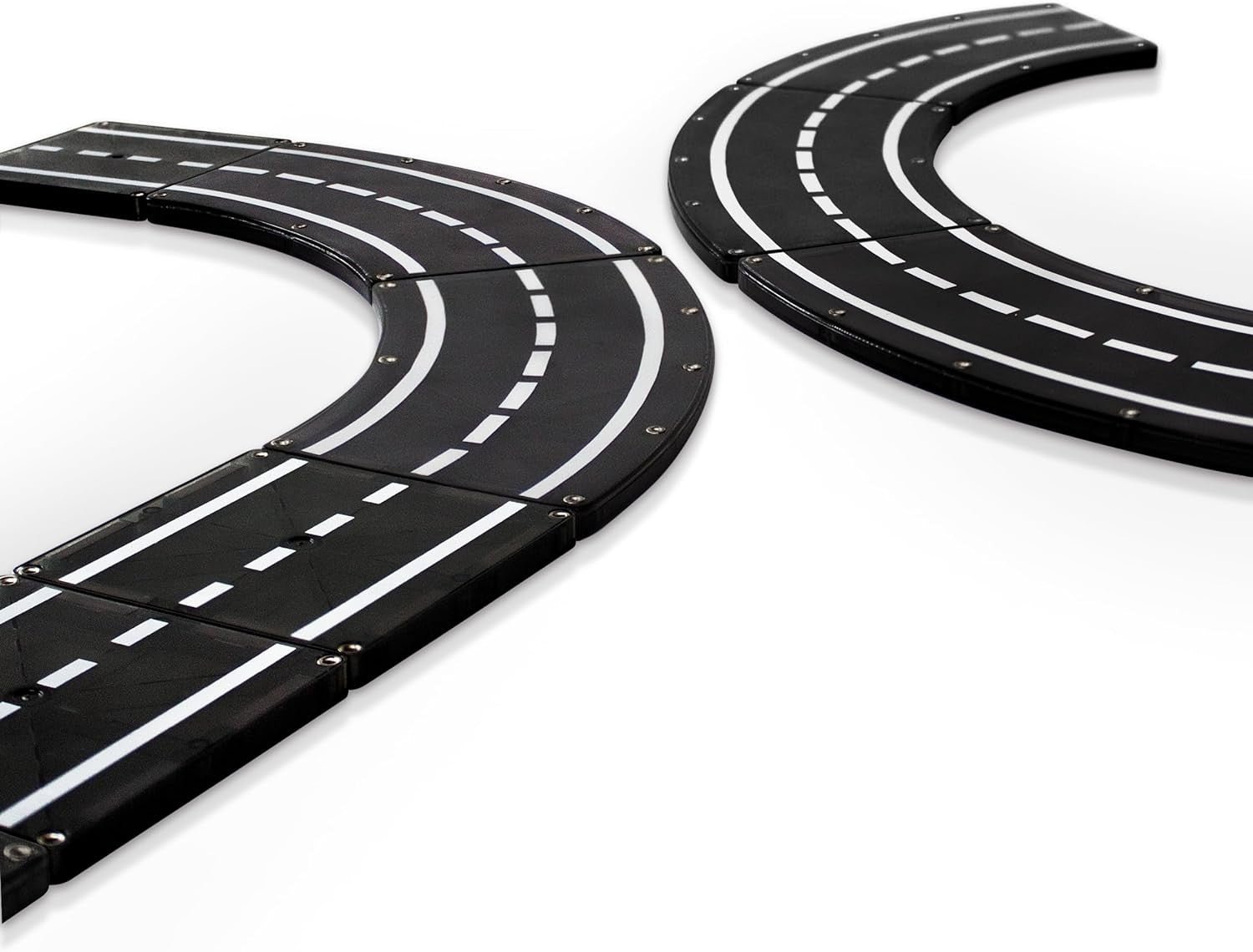 Incluye todas las piezas que necesitas para completar un círculo perfecto (8 Curvas) o una pista de carreras ovalada (8 Curvas + 4 Cuadradas).