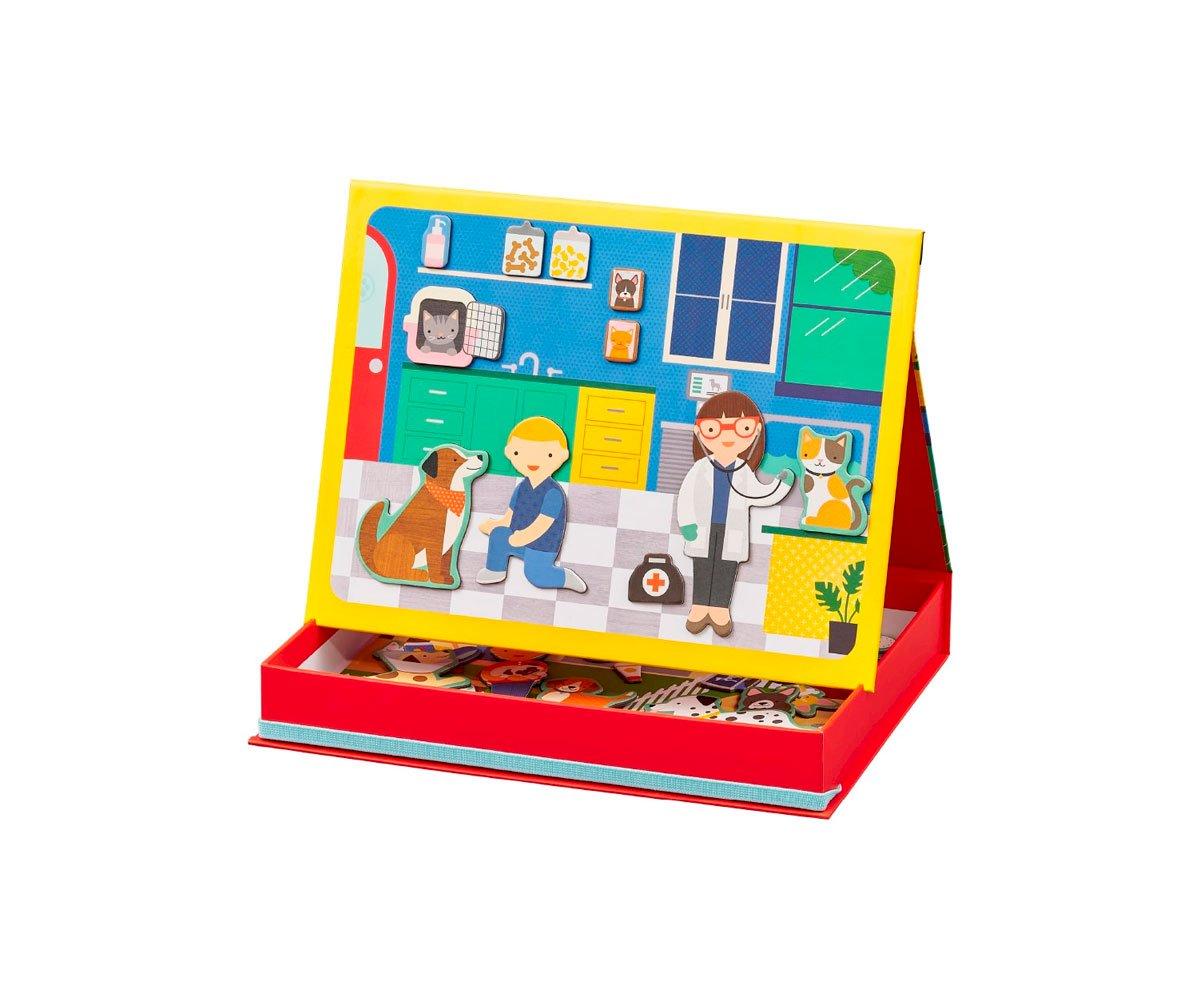 Con este juego magnético podremos crear una infinidad de combinaciones recreando diferentes escenas. Hay dos fondos para elegir y 50 piezas magnéticas para decorarlos y crear un montón de escenas. Perfecto para llevar a cualquier lado gracias a su cierre con cinta.