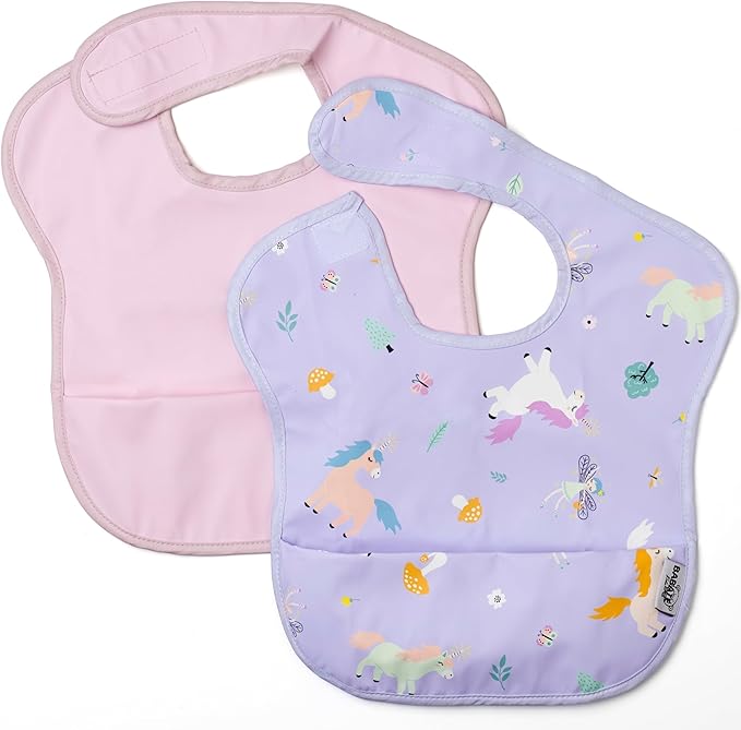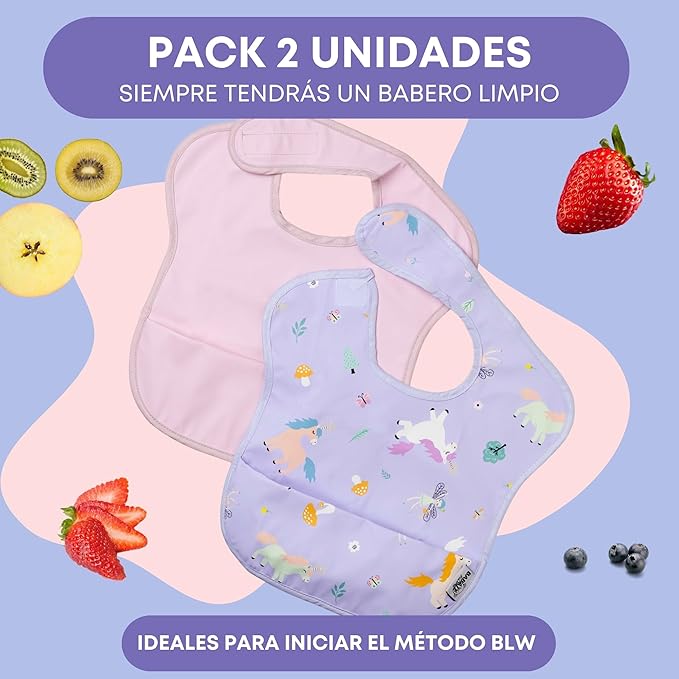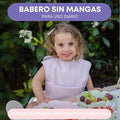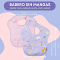Pack de dos baberos sin mangas con diseño ergonómico y cierre con velcro especial sin arañazos, pensado para durar hasta los 4-5 años.