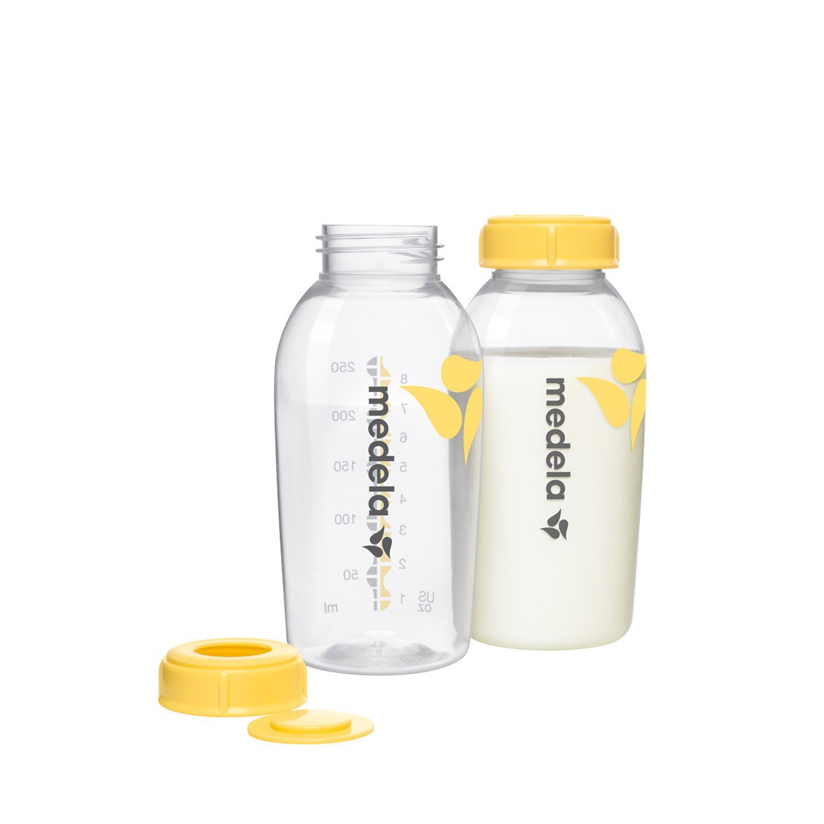 Los biberones de Medela son resistentes a los golpes y están disponibles en dos tamaños: de 150 ml en paquetes de tres unidades y de 250 ml en paquetes de dos unidades. Se pueden usar con todos los sacaleches y las tetinas de Medela. Los biberones para leche materna se pueden introducir tanto en el lavavajillas como en el microondas y están fabricados con materiales que no contienen bisfenol A.