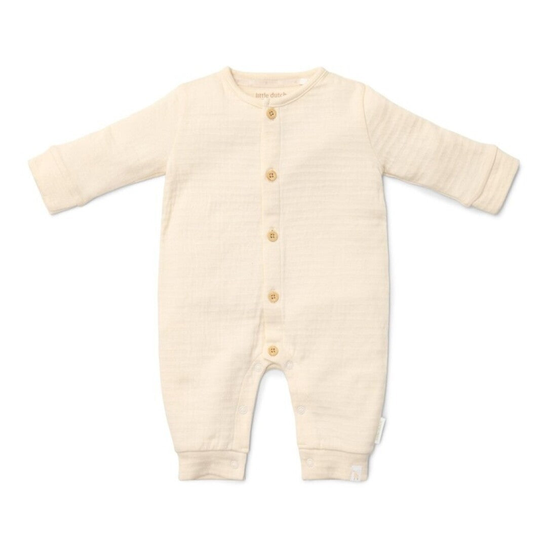 Material suave de dos capas finas de tela superpuestas que dan un efecto agradable, botones con efecto madera en el centro delantero y cierre de botones a presión en la entrepierna, fabricado en algodón orgánico, certificado Oekotex.