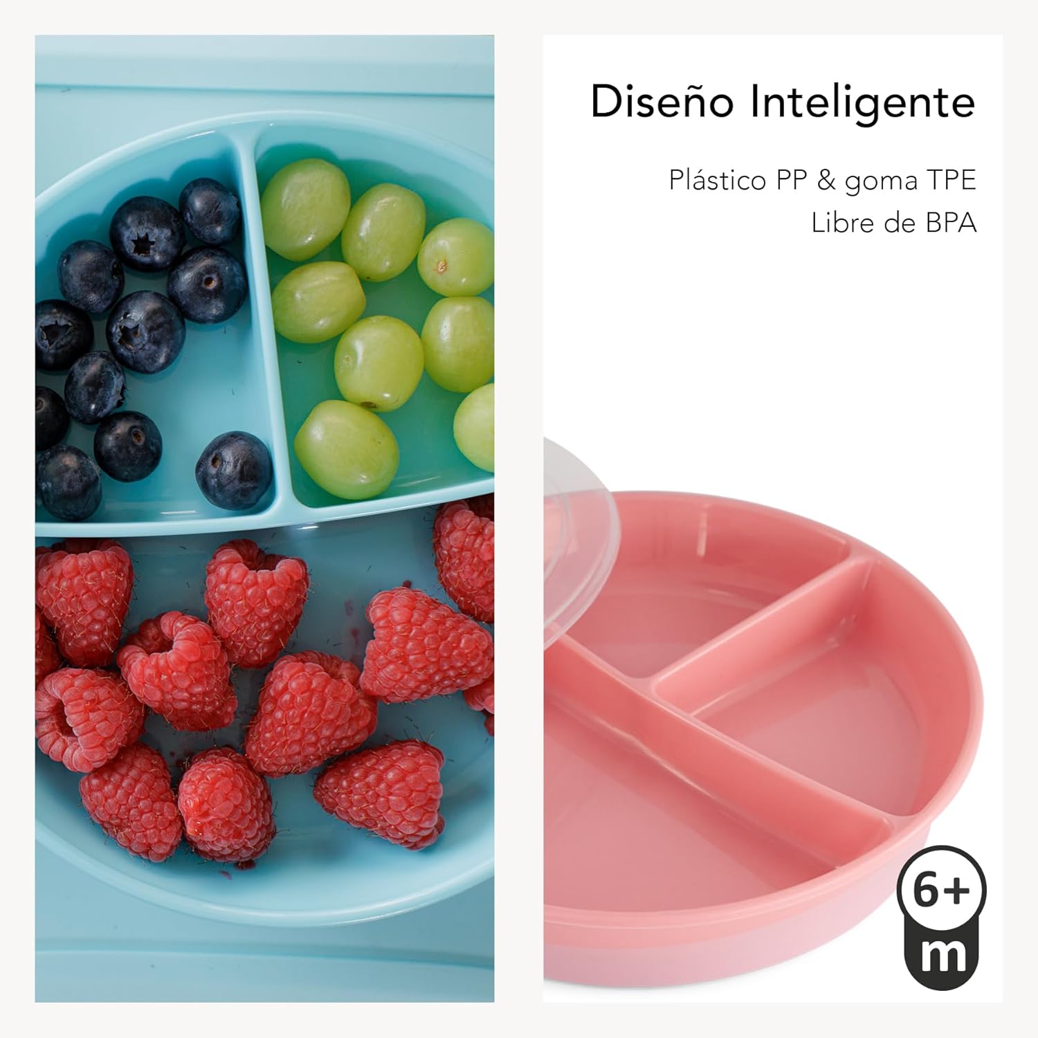 El plato dividido 6+m es el plato con 3 compartimentos de Twistshake que permite a tu hijo(a) separar la comida cuando no quiere mezclarla. Cada plato viene con una práctica tapa.