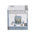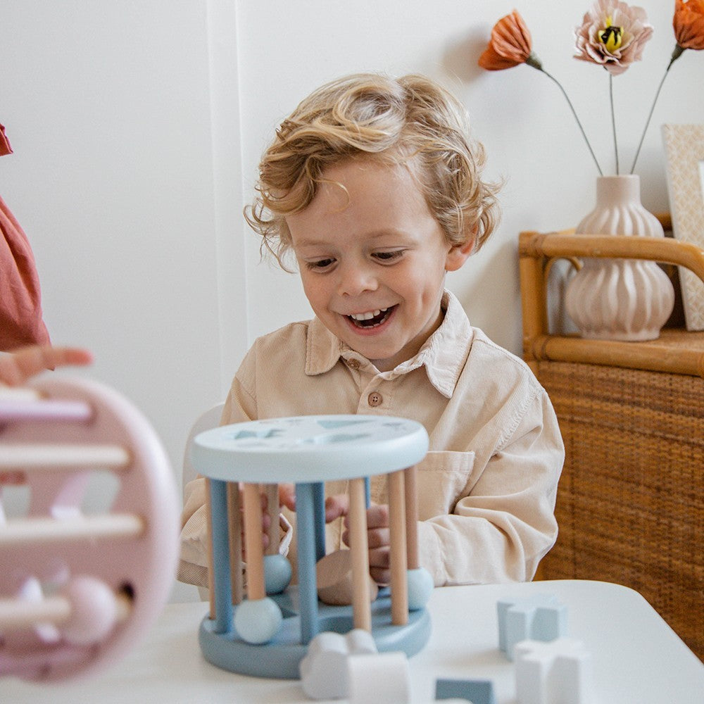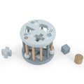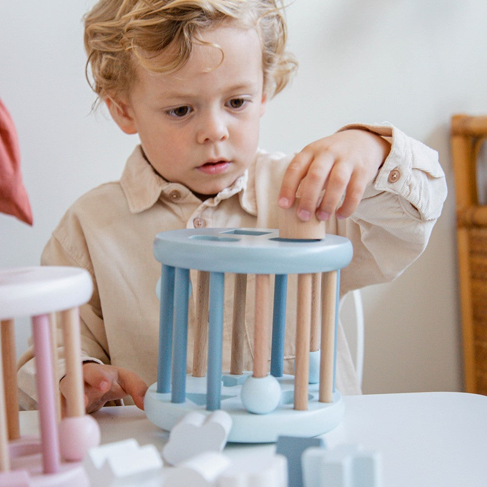 Inserte las diferentes formas de madera en los agujeros correspondientes y mueva la columna con la bola sobre ella para retirar las formas y volver a jugar.