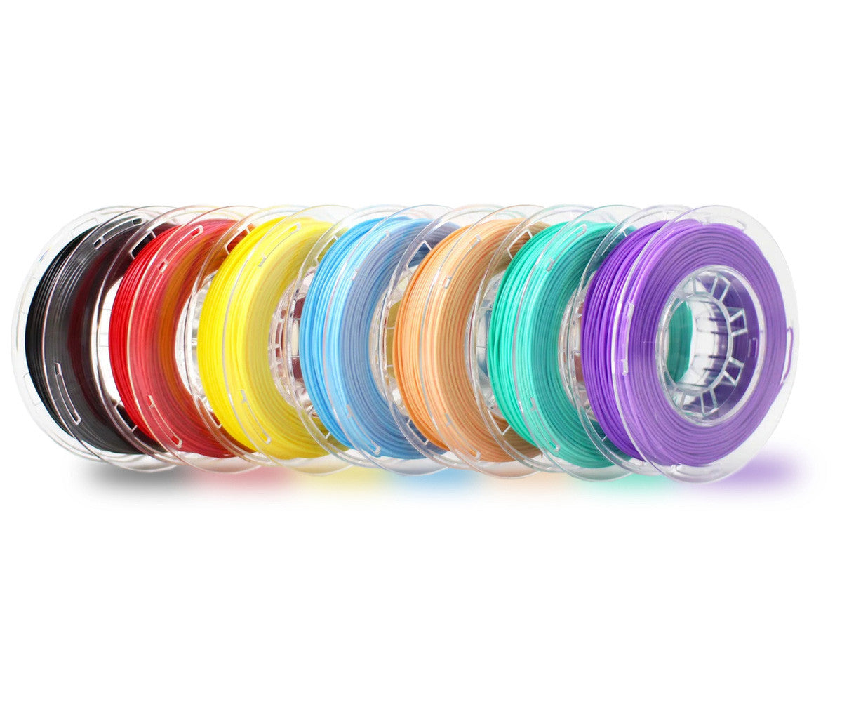 - Incluye 7 filamentos de colores para impresora 3D: Negro (Sésamo), Rojo (Cereza), Amarillo (Limón), Azul cielo (Algodón de Azúcar), Naranja Claro (Melocotón), Verde (Menta), Morado (Uva)