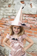 Elaborado con tela brillante en oro rosa, este sombrero irradia elegancia y glamour. Los adornos de murciélago le dan un toque caprichoso, convirtiéndolo en una pieza destacada. Ya sea que asistas a una fiesta de Halloween o simplemente quieras sacar a la bruja que llevas dentro, nuestro Sombrero de Bruja Glamorosa es el accesorio imprescindible para cualquier ocasión mágica. ¡Así que toma tu escoba y prepárate para hechizar a todos con tu estilo impecable!