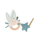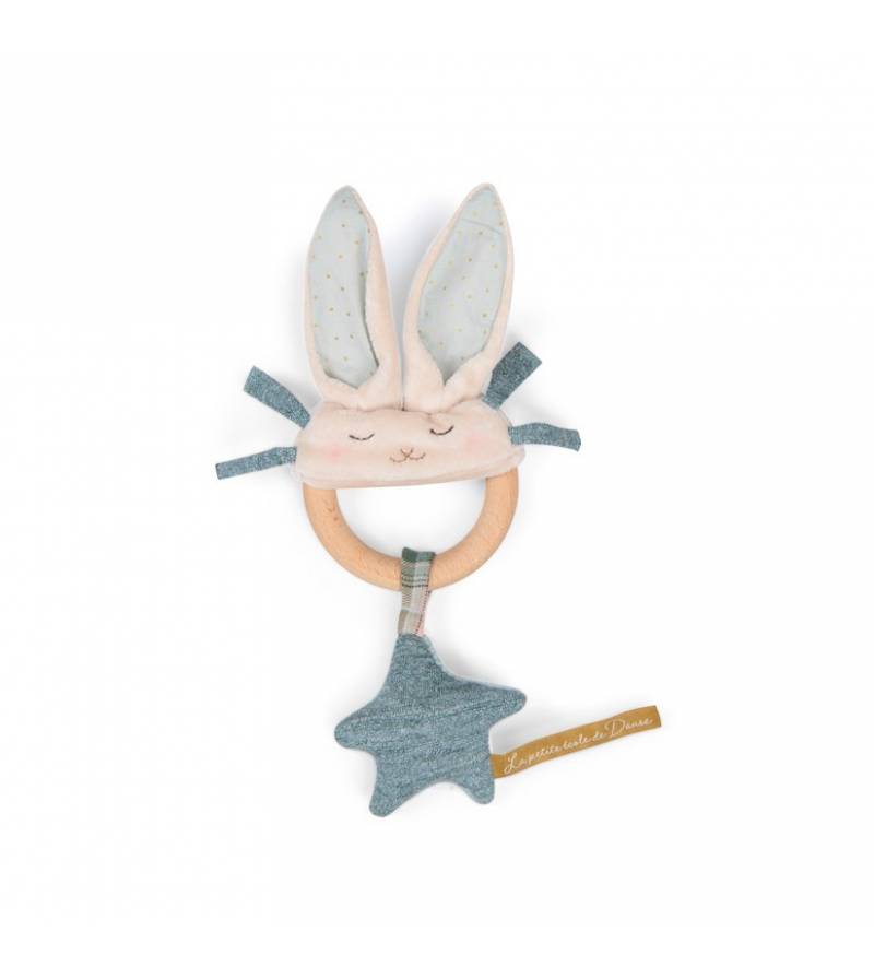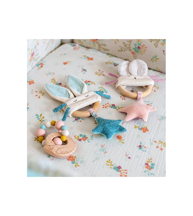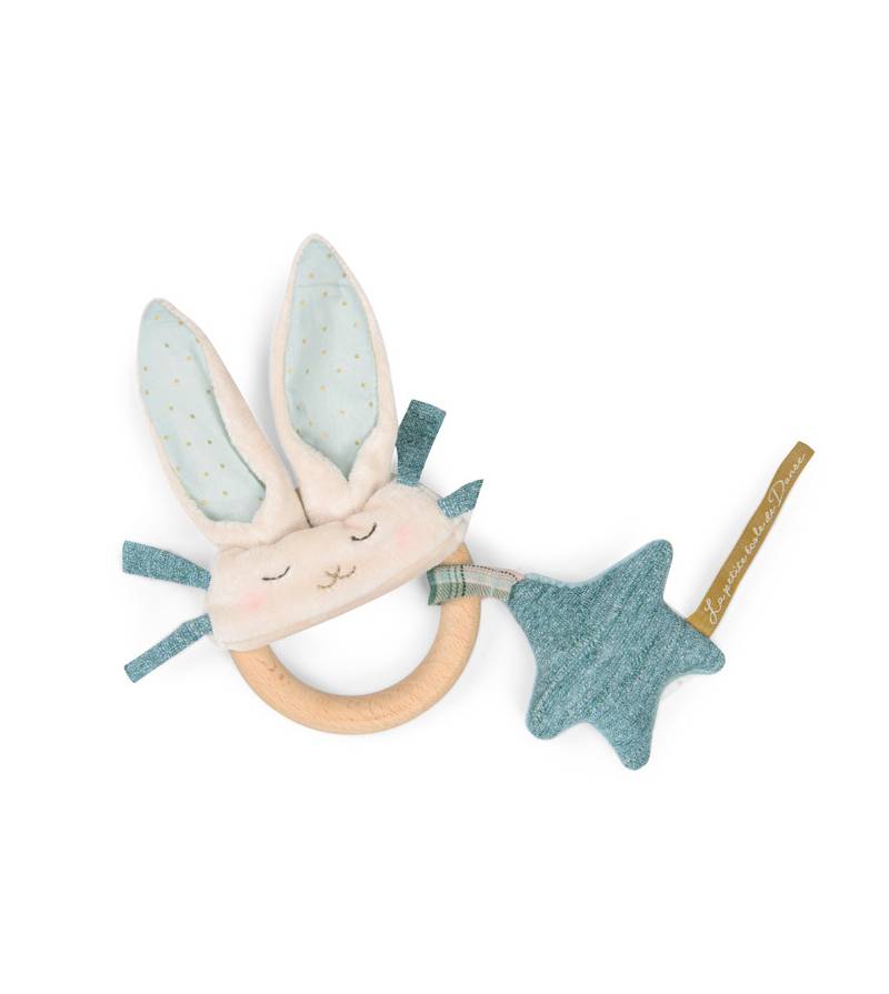 Sonajero Anilla Madera Conejo Azul La Petite École De Danse de Moulin Roty. El sonajero presenta un conejito de madera natural con detalles adorables. Su estrella, que emite un suave sonido de campana, añade un toque mágico a la experiencia sensorial de tu bebé. Con un anillo de madera fácil de agarrar y orejas de papel crujiente, estimulará la curiosidad y el desarrollo táctil de tu pequeño.
