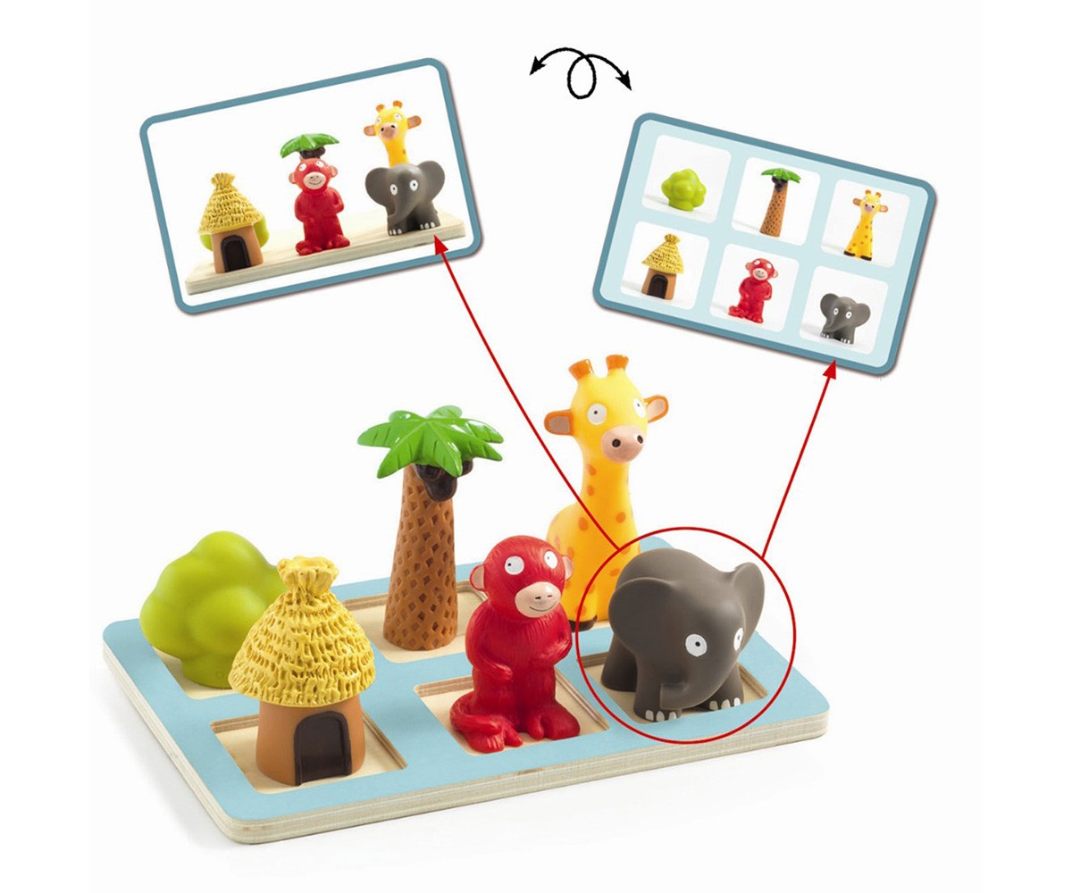 Delante, detrás, a un lado... La noción espacial es difícil de aprender por los pequeños, y por eso será más fácil explicárselo con figuritas. Para reproducir la foto, tu hijo deberá colocarlos correctamente en el tablero. ¿Dónde está la jirafa, delante o detrás del elefante? ¡Eduludo Spacio es el juego de manipulación ideal para aprender a orientarse en el espacio!