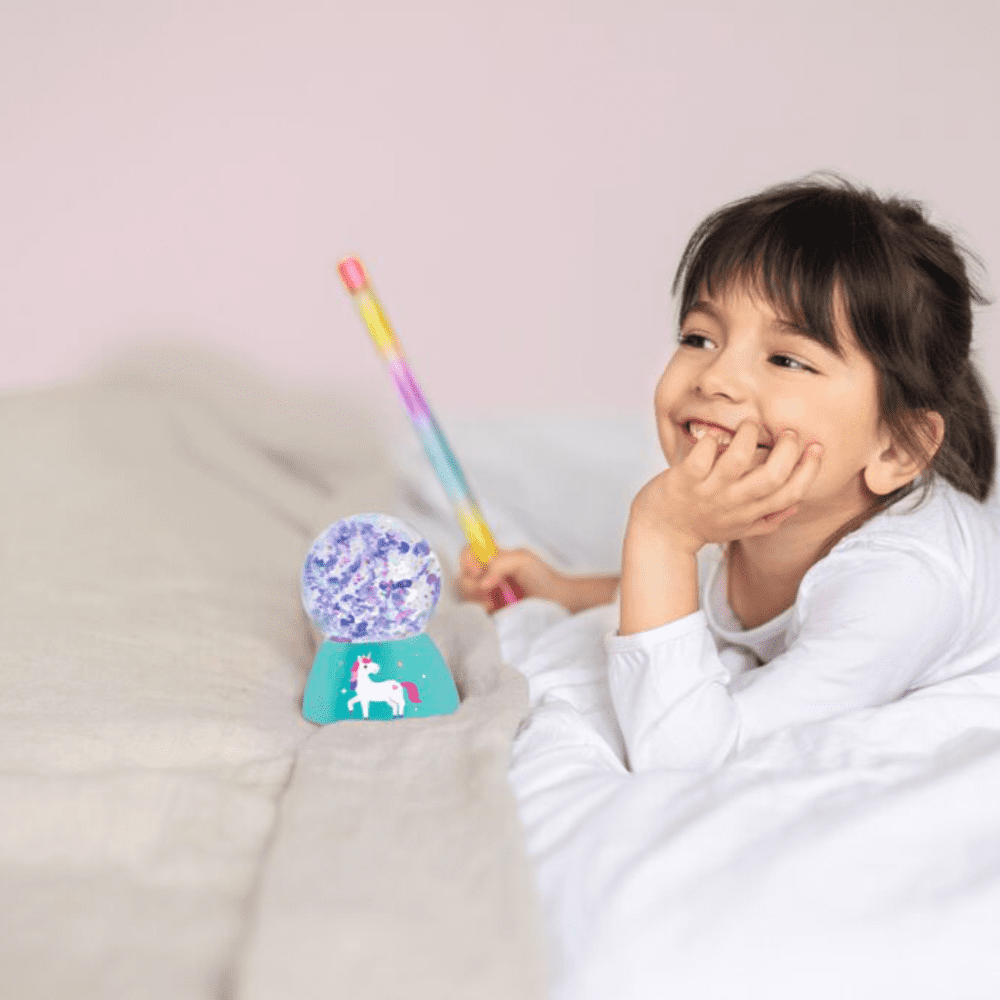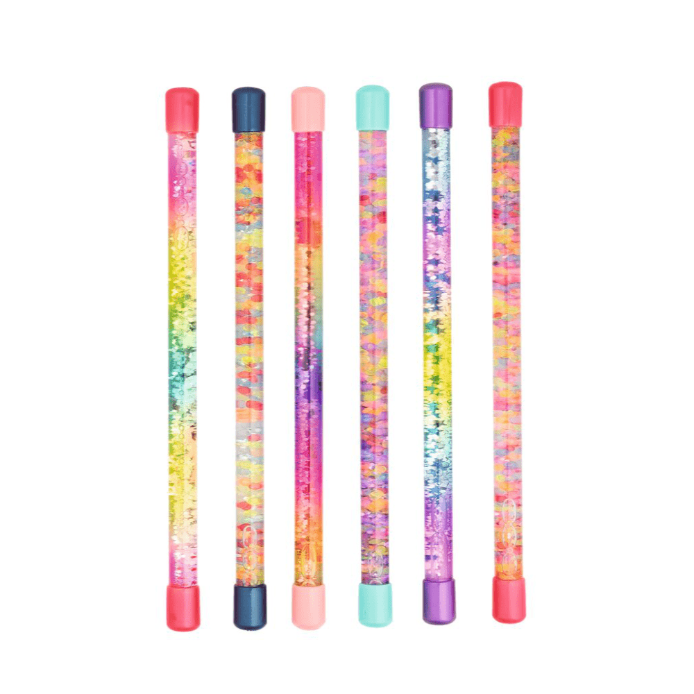 Varitas coloridas con confeti brillante, estrellas y unicornios de colores del arcoíris.