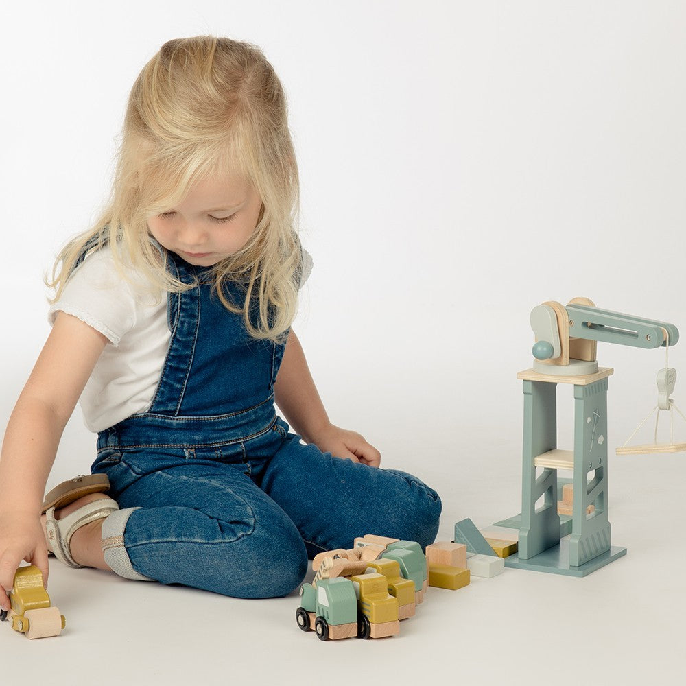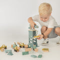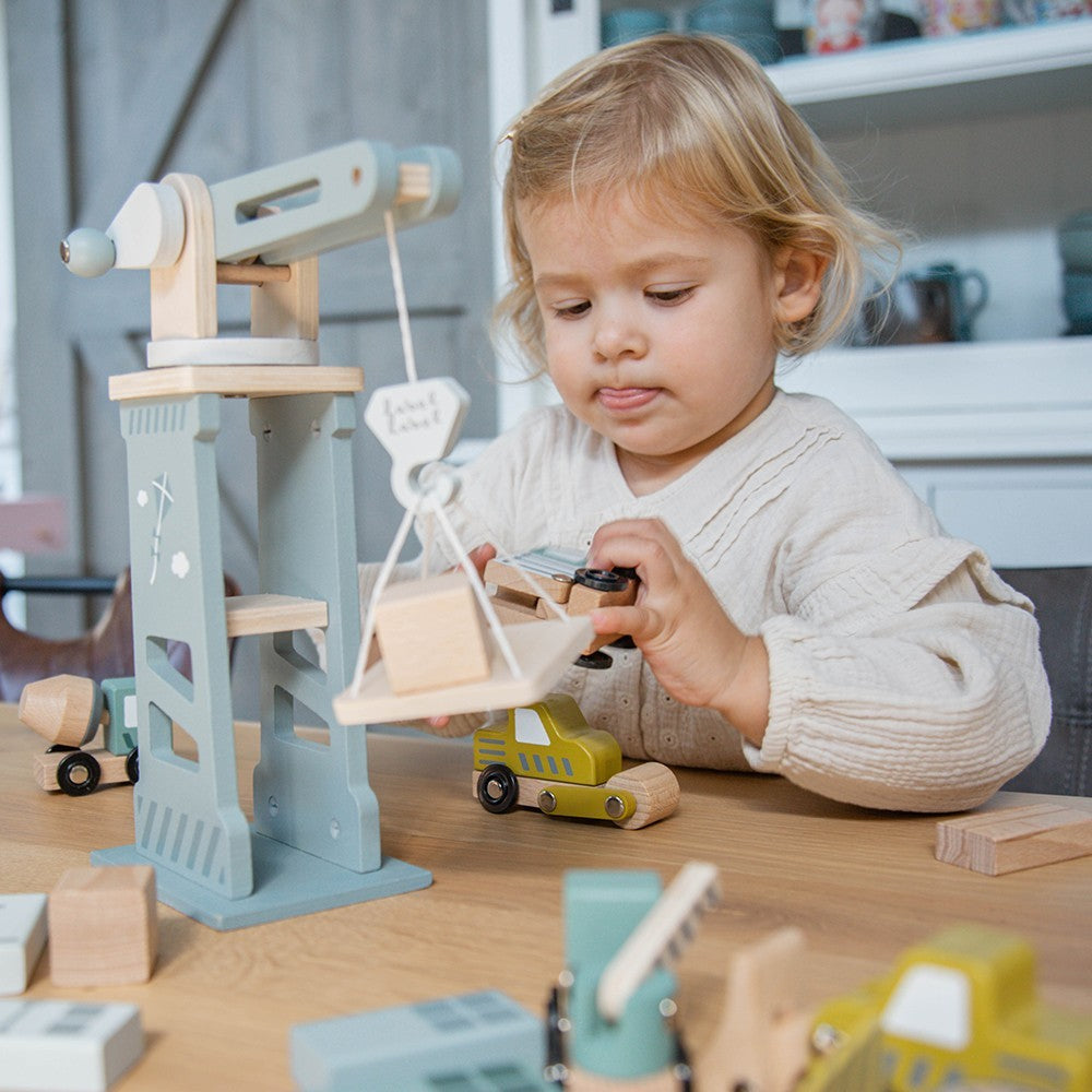 Todo muy ajetreado como puedes ver... El set consta de una grúa, 6 vehículos de construcción, un palé, 13 bloques de construcción y una señal de tráfico. Además de jugar y construir ocupados, los niños estimularán su creatividad, imaginación y coordinación mano-ojo. Consejo: ¡con el juego de bloques de madera Label Label creará aún más diversión construyendo!
